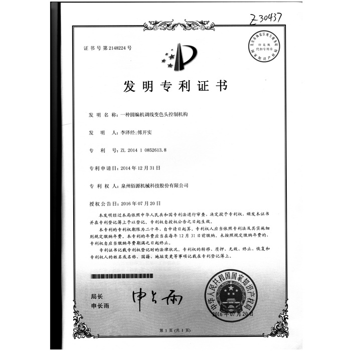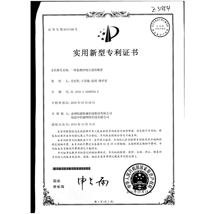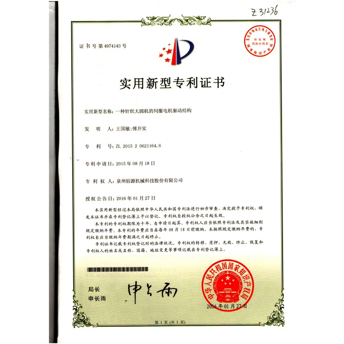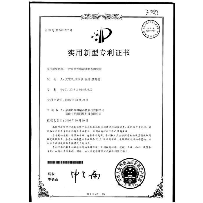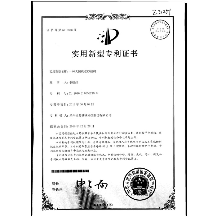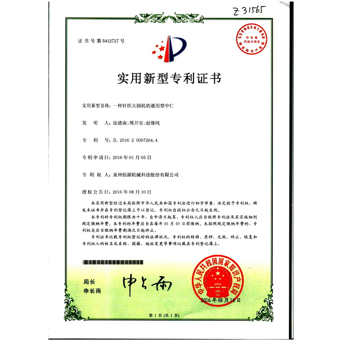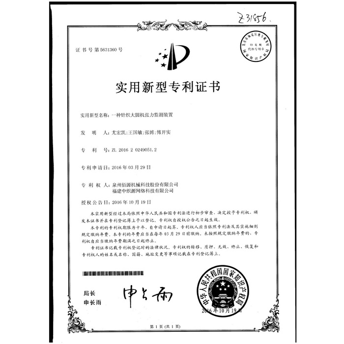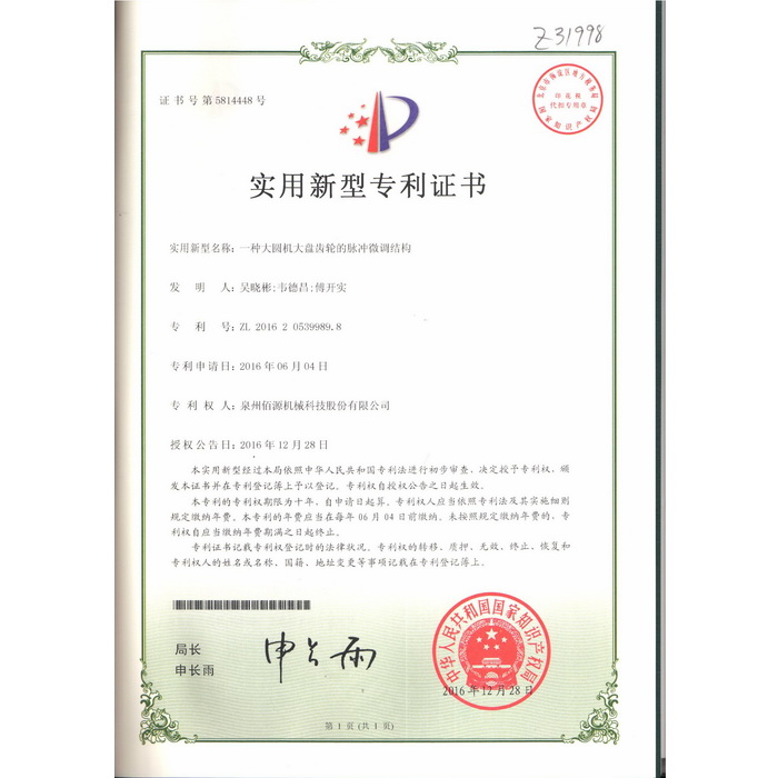 新型-泉州佰源機(jī)械科技股份有限公司 一種大圓機(jī)大盤齒輪的脈沖微調(diào)結(jié)構(gòu) 實用新型專利證書